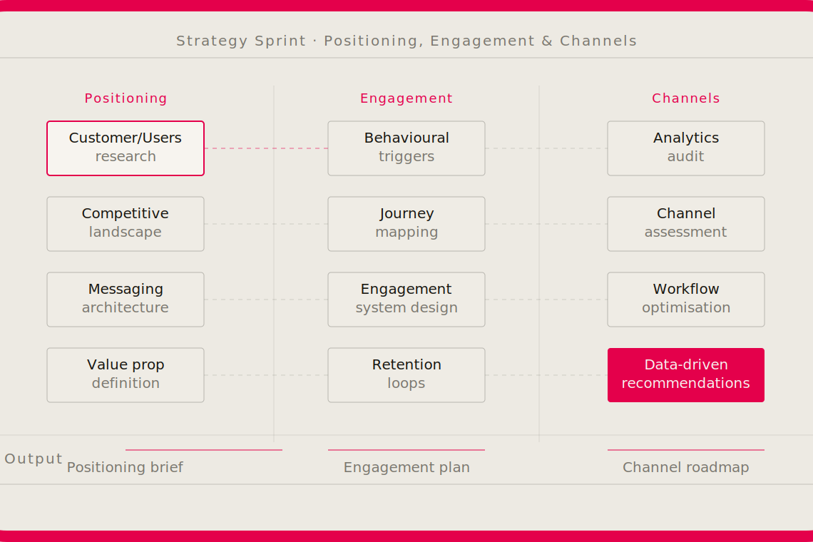 Neue Big helps organisations sharpen positioning, validate ideas, and turn fragmented insight into clearer products, services, and systems that support adoption and growth. Our work is especially relevant in complex, trust-sensitive sectors such as health, innovation, and digital products.